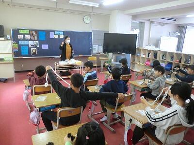 1年生の生活科では、「あきのおもちゃゲームセンター」に6年生を招待し、手作りのおもちゃで一緒に遊んでいました。「とんとんずもう」「けんだま」「ボーリング」どれも、どんぐりや松ぼっくり、葉っぱなどが使われていました。1年生と6年生が、笑顔いっぱいで遊ぶ姿に、見ているこちらも幸せな気持ちになりました。