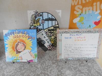 (図書室前には、今年度、国語の学習でお世話になった本を、教育活動支援員の土屋先生が、まとめて展示してくださっていました。本を見て、この1年間の国語の学習を思い出した人もいたようです。)