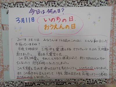 6年生では、3.11 東日本大震災により、全員そろって卒業式を迎えることのできなかった学校の映像をもとに、当時の生徒の気持ち、いのちの尊さについて考えていました。さらに、卒業式を迎えられることは当たり前ではなく、とても幸せなことであることに気付き、自分たちが間もなく卒業式を迎えるにあたり、「何のために卒業式をするのか」、「卒業式でどんな姿をめざすのか」、「残りの卒業式練習でどんなことに心がけるのか」について考えを深めていました。その後、14:46分、亡くなられた方々のご冥福を祈り、黙とうを捧げました。