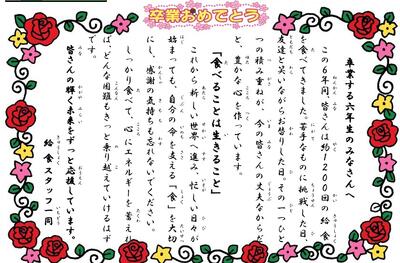 今年度最後の給食!おいしい給食をいつもありがとうございました 投稿: さくらんぼ (17:15) カテゴリー: 今日の出来事 今日は、今年度最後の給食の日でした。そして、6年生にとっては小学校最後の給食となりました。 6年生は、卒業プロジェクトの1つとして、給食の時間に毎日一人ずつ、在校生へのメッセージを発表してきました。在校生への感謝の気持ち、素敵なところ、これからも頑張ってほしいこと等、一人一人が話す内容に、毎回感動しました。明日は修了式。卒業式まであと2日となりました。 Tweet -