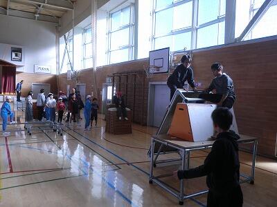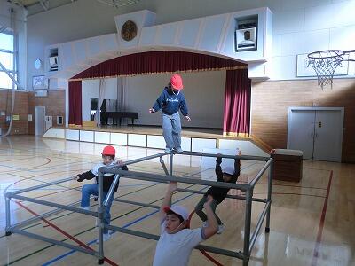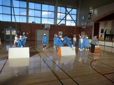 県内でスポーツ活動を推進している「キマイラ」代表の荒木優希さんを講師としてお招きし、子どもたちがパルクールを体験しました。(パルクールとは、体一つで跳んだり、くぐったり、渡ったりと、移動をトレーニングとして行うスポーツ)体の使い方や注意点を教えていただいた後、早速、体育館に設置された器具を使ってパルクールにチャレンジしました。子どもたちは、移動の仕方や体の使い方を自分の頭で考えながら楽しく取り組んでいました。回数を重ねるごとに移動の仕方に工夫が見られ、心も頭も体もフル回転で楽しんでいました。
